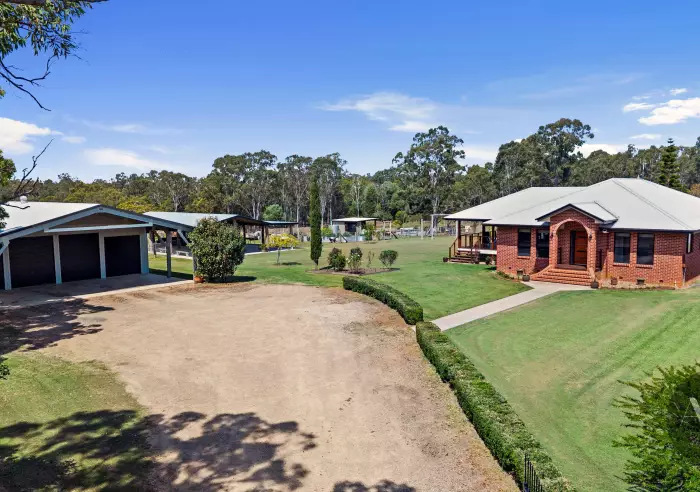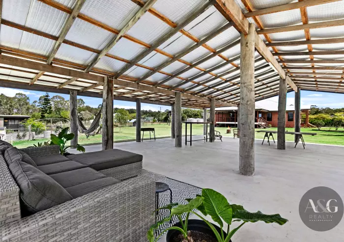 Beyond the home, the acreage is equally impressive. A 14.5m x 11m barn-style entertaining pavilion brings rustic character, while the 12m x 13m powered high-clearance shed and 7m x 12m lock-up workshop provide outstanding infrastructure for vehicles, tools, and projects. The fully fenced 2.5 acre allotment with separate yard sections ensures practicality and lifestyle flexibility.