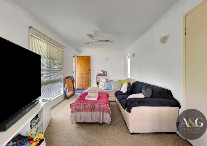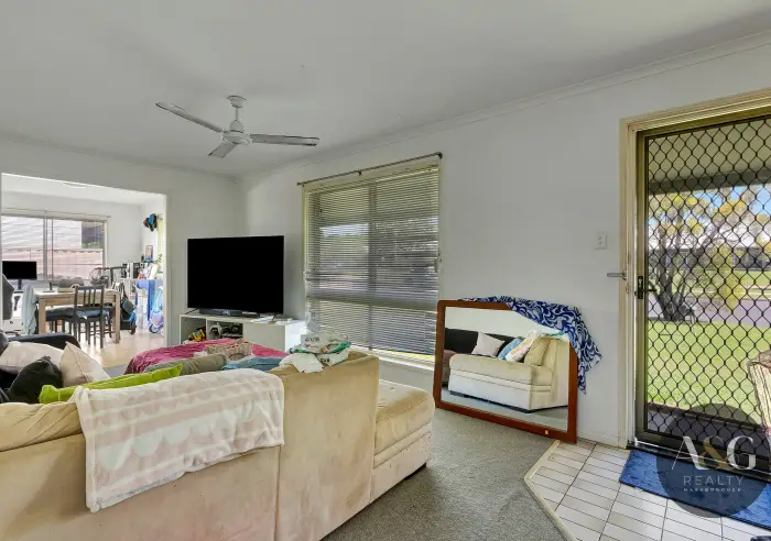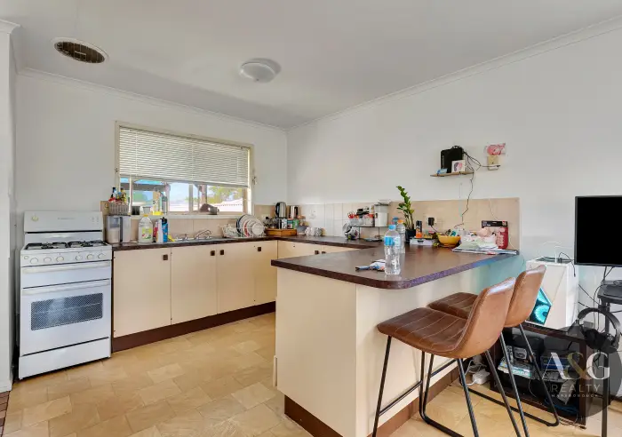 Positioned on a generous 857m² allotment, the home features a tidy kitchen that flows through to the dining and living area, creating a practical layout for everyday living.